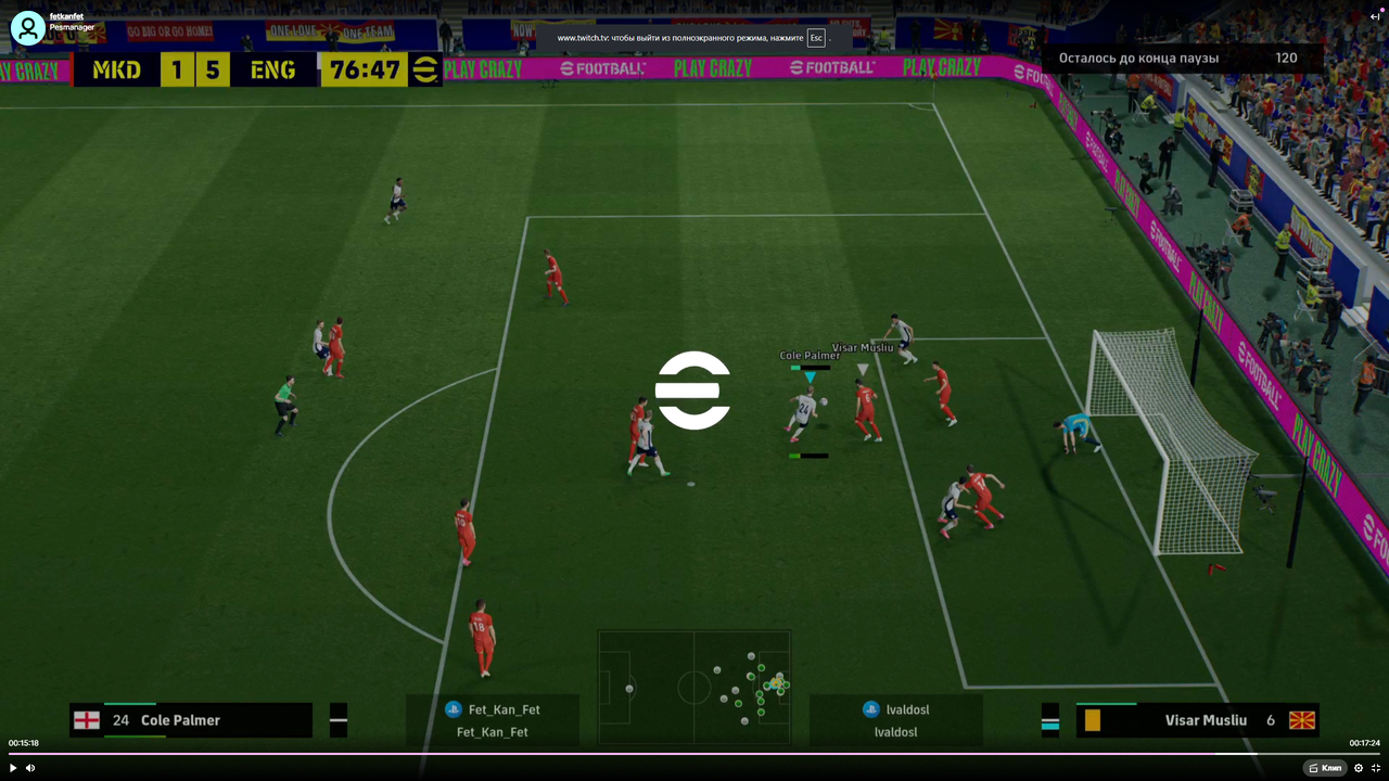 - после 60 минут второго тайма: счет который был до вылета сохраняется и в качестве доигровки играется время, которое осталось плюс 5 минут добавленного времени (например, вылетело на 78 минуте, играете 12+5 минут игрового времени), установка времени матч 10 минут, далее соперники делают скрин статистики и голов. На этом матч окончен и вносится результат с оформлением матча.