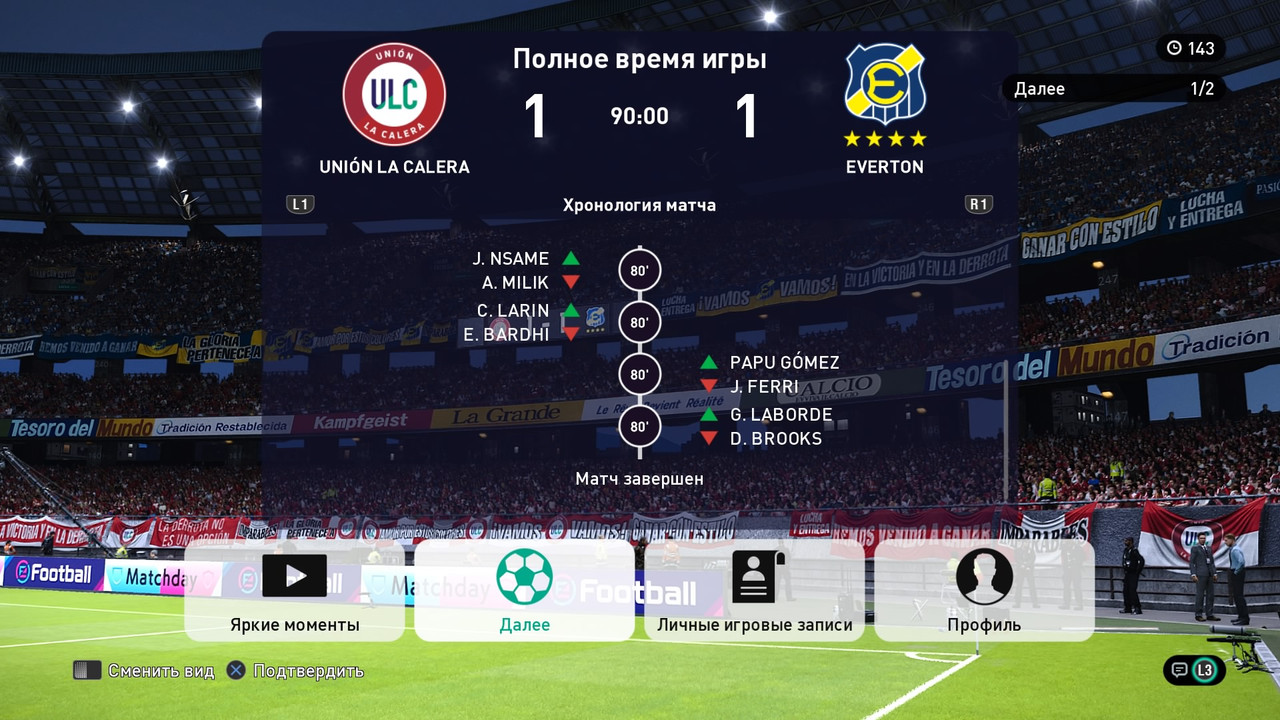 - после 60 минут второго тайма: счет который был до вылета сохраняется и в качестве доигровки играется время, которое осталось плюс 5 минут добавленного времени (например, вылетело на 78 минуте, играете 12+5 минут игрового времени), установка времени матч 10 минут, далее соперники делают скрин статистики и голов. На этом матч окончен и вносится результат с оформлением матча.