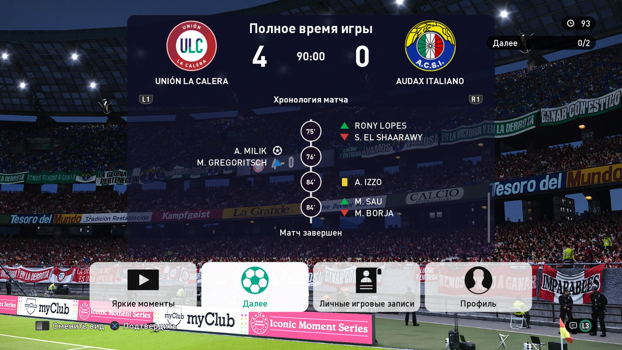 - после 60 минут второго тайма: счет который был до вылета сохраняется и в качестве доигровки играется время, которое осталось плюс 5 минут добавленного времени (например, вылетело на 78 минуте, играете 12+5 минут игрового времени), установка времени матч 10 минут, далее соперники делают скрин статистики и голов. На этом матч окончен и вносится результат с оформлением матча.