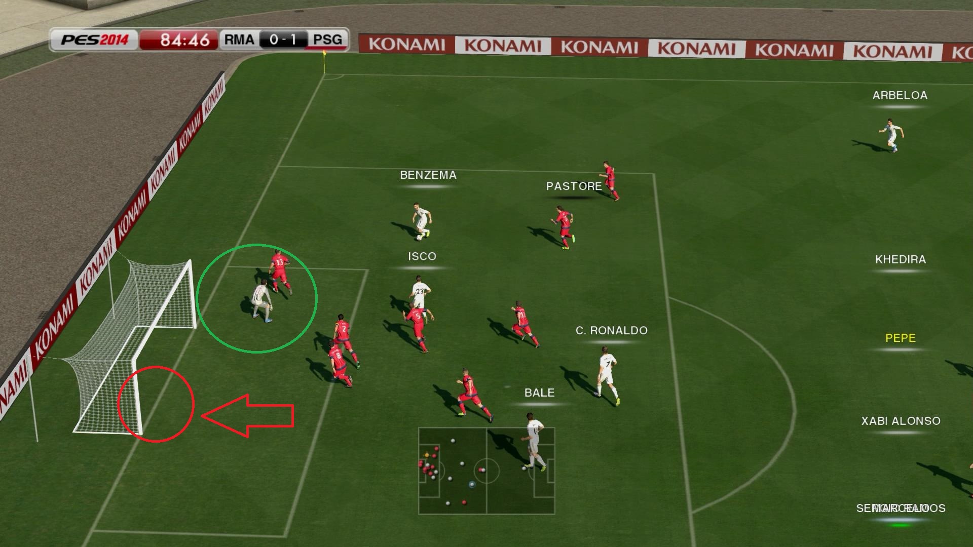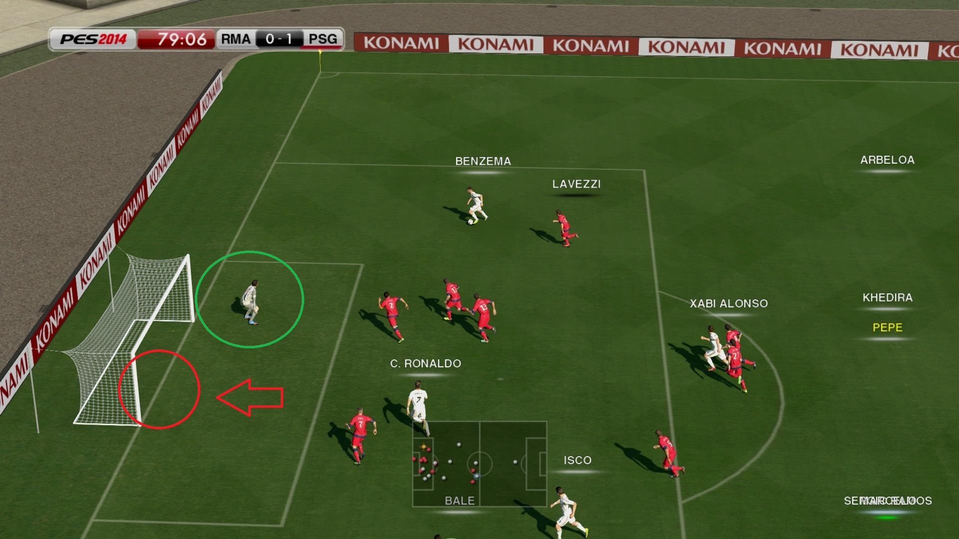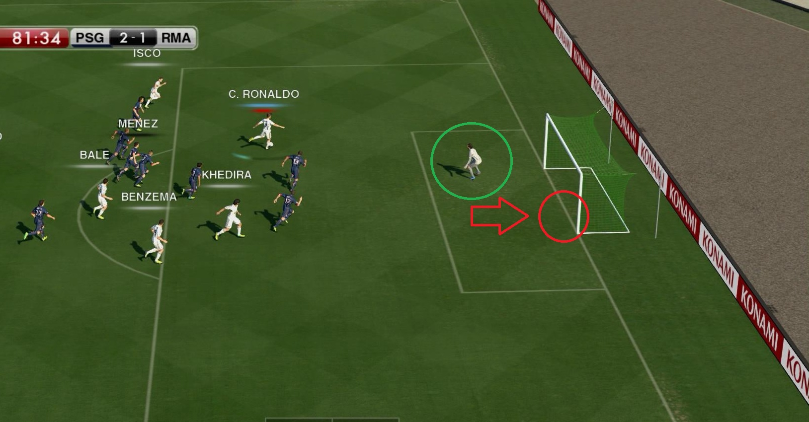 №2. Практически идентичная ситуация 5 минут спустя. До конца встречи всего ничего, мы по-прежнему минимально уступаем в счете. Вариантов продолжения атаки нету. Можно отдать пас на Иско, но тому бить не куда, по центру и ближний вратарь тащит, а в дальний угол в 1 касание еще попасть нужно плюс там Тьяго Сильва и Мотта бегут в направлении и вероятнее всего заблокируют удар.