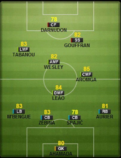 Полузащита: еще один тихоход команды - португалец со странной фамилией (всего 1 согласная). в качестве ЦПЗ выступает Аромга (кличка БОХ). в роли атакующего ПЗ - новобранец команды Весли. Не Снейдер, конечно, но... обещал приносить много пользы команде (подай/принеси и т.п). Слева еще один француз. еще полсезона назад он блистал на поле... но потом, что то случилось и он сильно сдал (то ли ипотека его подкосила, то ли японские таблетки под названием "DLC" [разновидность LSD?!?!]).