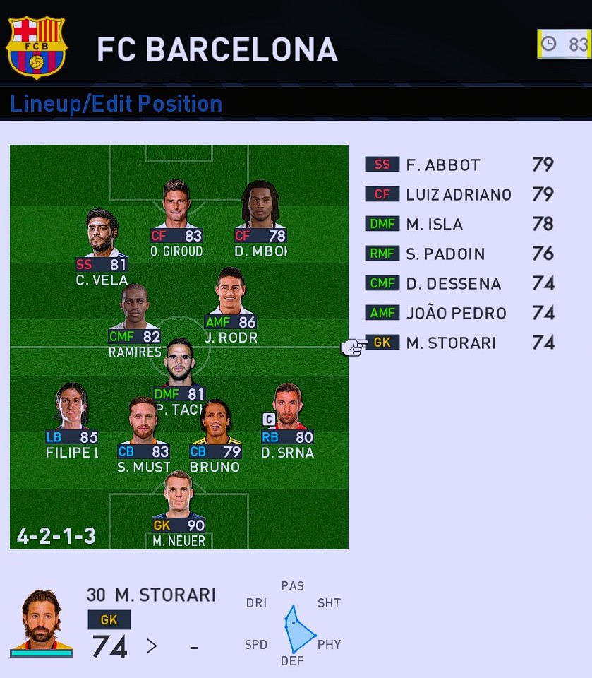 3. В команде 25 игроков (Berisha - GK и Klose - CB, их не видно на скрине), хорошего среднего уровня, в расчёт идут кондиции, а не общий скилл игрока, так, как отдельные скиллы по позициям меня устраивают.