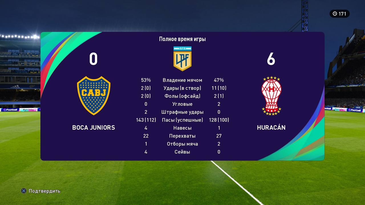 - после 60 минут второго тайма: счет который был до вылета сохраняется и в качестве доигровки играется время, которое осталось плюс 5 минут добавленного времени (например, вылетело на 78 минуте, играете 12+5 минут игрового времени), установка времени матч 10 минут, далее соперники делают скрин статистики и голов. На этом матч окончен и вносится результат с оформлением матча.