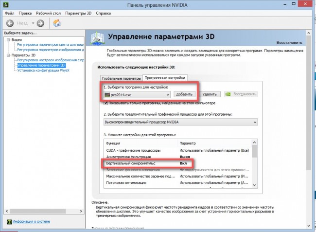 если у тебя карта Г-форс, то в панели управления Nvidia надо зайти в настройки 3д и выбрать приложение - Pes14. ну и собственно в появившихся настройках выбрать "ВКЛ верт.синх."