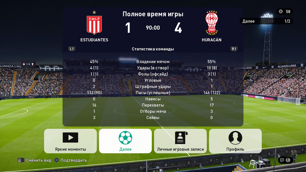 - после 60 минут второго тайма: счет который был до вылета сохраняется и в качестве доигровки играется время, которое осталось плюс 5 минут добавленного времени (например, вылетело на 78 минуте, играете 12+5 минут игрового времени), установка времени матч 10 минут, далее соперники делают скрин статистики и голов. На этом матч окончен и вносится результат с оформлением матча.